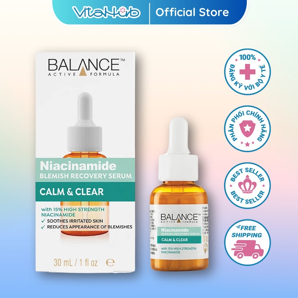 Balance Active Formula là thương hiệu mỹ phẩm đến từ Anh với phương châm tạo ra các sản phẩm chăm sóc da có thành phần độc đáo, hiệu quả cao với mức giá bình dân. Tinh chất ngăn mụn mờ thâm Balance Active Formula Niacinamide Blemish Recovery Serum là một loại tinh chất nhẹ dạng nước với 15% Niacinamide - một loại Vitamin B3 tự nhiên giúp giảm dầu thừa, giúp lỗ chân lông được thu nhỏ lại. Đồng thời, làm giảm các nhược điểm trên da và làm mờ vết thâm, giúp cải thiện kết cấu da và khuyến khích làn da khỏe mạnh.